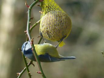 Keywords: tit blue tit cyanistes caeruleus parus caeruleus paridae small bird bird animal eat peck depend claws out fat balls food bird seed feed network hang winter