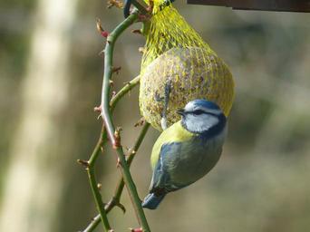 Keywords: tit blue tit cyanistes caeruleus parus caeruleus paridae small bird bird animal eat peck depend claws out fat balls food bird seed feed network hang winter