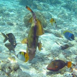 | Keywords: Titan Triggerfish2.jpg Titan Triggerfish Balistoides viridescens Also visible are from the top right clockwise a double-saddled butterflyfish Chaetodon falcula a Blue surgeonfish Acanthurus leucosternon a Halfmoon triggerfish Pseudobalistes fuscus an Orange-lined triggerfish Balistapus undulatus another double-saddles butterflyfish a rabbitfish Siganus and a grouper Two cleaner wrasses Labroides dimidiatus are checking out the titan's fin for food Photographed by Jan Derk in March 2006 in Fihalhohi Maldives own 2006-03 Jan Derk janderk Balistoides viridescens Chaetodon falcula Acanthurus leucosternon Pseudobalistes fuscus Balistapus undulatus Labroides dimidiatus Fish of the Maldives |