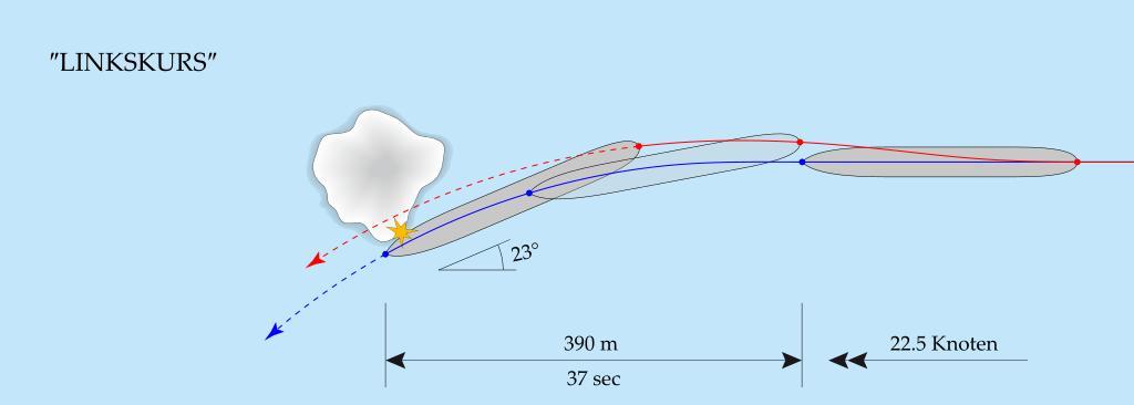 | Keywords: Titanic turning circle.svg en Turning Circle of the Titanic de Wendekreis der Titanic own Ray ray ray 2011-01-14 50px GIF version used as template created with Adobe Illustrator Titanic collision formulae used to calculate ship´s movement derived from http //titanic-model com/articles/Two_Points_in_Thirty_Seven_Seconds/Two 20Points 20in 20Thirty-Seven 20Seconds pdf <math> \begin alignat 2 \text heading angle \quad \psi_i \begin cases 0 046 t 2 - 4 508 e -t/7 - 0 644t + 4 508 0 \leq t \leq 10 \\ 0 92 t + 14 3037 e -t/7 - 11 0402 10 < t \end cases \\ \text drift angle \quad \beta_i 18\cdot 850/1875 \cdot 1-e -t_i/35 \\ \text speed \quad v_i 22 5 \cdot 1 68781 \cdot \sqrt 1+0 01\beta_i 2 \\ m_ i+1 t_ i+1 -t_i \cdot v_i \cdot \cos \frac \psi_ i+1 -\beta_ i+1 +\psi_i-\beta_i 2 \\ \text position \quad x_i \sum_ j 0 i m_j \\ n_ i+1 t_ i+1 -t_i \cdot v_i \cdot \sin \frac \psi_ i+1 -\beta_ i+1 +\psi_i-\beta_i 2 \\ \text position \quad y_i \sum_ j 0 i n_j \end alignat </math> Cc-zero |