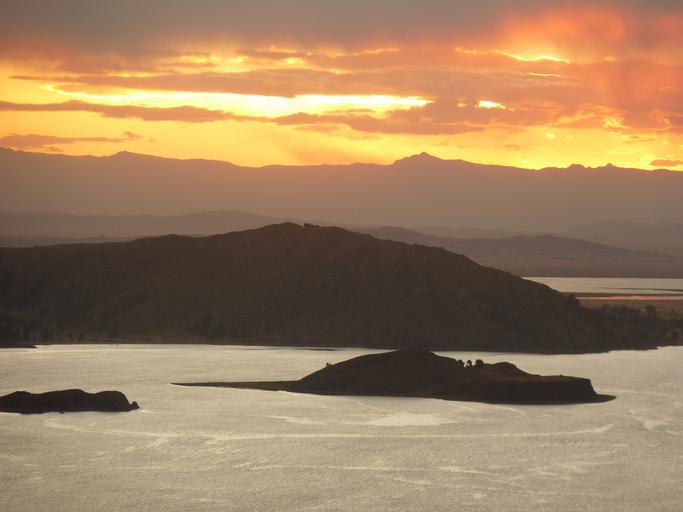 Keywords: titiicaca see peru lake waters koenigskordilleren mountains sky fiery embers burning