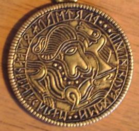 | Keywords: Tjurko bracteate replica.jpg brass replica of the Tjurkö 1 bracteate DR BR75 Statens Historiska Museum 1453 heldaz kunimudiu wurte runoz an walhakurne Helda for Kunimundi wrought the runes on the Roman coin the original bracteate is of gold with a diameter of 27 mm the facsimile was obviously made after http //skaldic arts usyd edu au/db php table images id 21005 this drawing exaggerating the gap before the o of runoz and showing a short-twig Younger Futhark a in an judging from the image linked above both without basis in the original http //www canadianmysteries ca/sites/vinland/images/site/163809_2 jpg herehttp //skaldic arts usyd edu au/db-jpeg php is another image of the original own 2006-05-02 User Dbachmann Archaeological record of Odin Archaeological finds from Blekinge Statens historiska museum Replicas of archaeological objects Migration Period bracteates in Sweden Elder Futhark inscriptions |