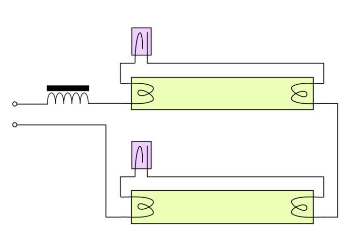 Keywords: Tl-tube-series.svg Twee TL-buizen in serieschakeling ontstoringscondensatoren weggelaten eigen werk inkscape 20070511 KoenB public domain Light-generating objects