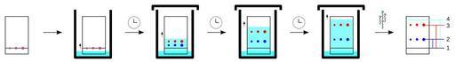 | Keywords: Tlc sequence.svg A mixture is added to the base line 1 shown as purple spots The TLC plate is placed in a solvent tank and the solvent moves up the plate A lid ensures that the atmosphere in the tank is saturated with solvent As the solvent moves up the plate the purple mixture separates into a fast moving red spot and a slower moving blue spot The R<sub>f</sub> of each spot is worked out by measuring the distance the spot moved relative to the distance the solvent moved i e for the red spot the R<sub>f</sub> is 1 to 3 / 1 to 4 and for the blue spot the R<sub>f</sub> is 1 to 2 / 1 to 4 The R<sub>f</sub> of the red spot is larger meaning that it has moved further along the plate in that solvent than has the blue spot In this case it can be seen that the purple spot can be separated easily into 2 spots using the light blue solvent Tlc_sequence png 50 2012-01-31 12 02 UTC Tlc_sequence png Quantockgoblin derivative work Shakiestone <span class signature-talk >talk</span> translation Tlc_sequence png </nowiki> 2007-01-26T22 28 48Z Quantockgoblin 800x164 3873 Bytes <nowiki> chromatography</nowiki> Uploaded with derivativeFX Thin layer chromatography |