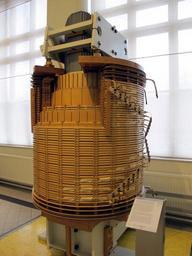 | Keywords: TMW 50971 Transformatorschenkel eines Leistungstransformators mit aufgeschnittenen Wicklungen.jpg Außenschenkel eines dreischenkeligen Leistungstransformators für Drehstrom Der in der Mitte befindliche Eisenkern besteht aus gegeneinander isolierten geschichteten Trafoblechen Der Eisenquerschnitt wird durch Abstufungen an die kreisförmige Querschnittsform angepasst Die Unterspannungswicklung Mitte ist zylinderförmig ausgeführt die außen befindliche Oberspannungswicklung ist spulenförmig angeordnet Als innerste und kleinste Wicklung ist eine Tertiärwicklung zur Kompensation von Schieflasten angebracht Die Wicklungen bestehen aus Kupferschienen und sind durch Isoliermaterialien getrennt Im Betrieb befinden sich drei dieser Schenkeln in dem vollständig mit Isolieröl gefüllten Transformatorgehäuse <br/> Oberspannungseite 110 kV mit maximal 210 A<br/> Unterspannungseite 10 kV mit maximal 2179 A<br/> Gesamtleistung des Trafos 40 MVA<br/> Baujahr 1999<br/> Hersteller VA Tech Elin EBG GmbH Internal construction of one phase of a TMW 50971 electric utility power transformer for three-phase alternating current The iron core in the center consists of a stack of silicon steel laminations The core cross section is adapted by gradations to the circular cross-sectional shape of the coil The secondary winding center is implemented cylindric the primary voltage winding outside present is wounded around the other windings and the core The internal and smallest coil is a tertiary winding used for the compensation of phase imbalances The windings consist of copper rails separated by insulating materials There are three of these legs in the complete transformer which is contained in a housing which is completely filled with insulating oil <br> Primary winding 110 kV with a max current capacity of 210 A<br> Secondary winding 10 kV with a max current capacity of 2179 A<br> Power 40 MVA<br> Manufactured in 1999 by VA Tech Elin EBG GmBH 19 3 2011 Museum Technisches Museum Wien accession number 50971 Technisches Museum Wien - Energie Utility transformers ImageNote 1 932 1477 364 329 1704 2272 2 Anschlüsse der Oberspannungsseite zum Stufenschalter ImageNoteEnd 1 ImageNote 2 250 746 114 401 1704 2272 2 Schnitt durch die Oberspannungswicklung ImageNoteEnd 2 ImageNote 3 367 678 95 295 1704 2272 2 Schnitt durch die Unterspannungswicklung ImageNoteEnd 3 ImageNote 4 473 678 34 144 1704 2272 2 Schnitt durch die Tertiärwicklung žRegelwicklung ImageNoteEnd 4 ImageNote 5 553 140 273 481 1704 2272 2 Teil des Eisenkerns Schenkel ImageNoteEnd 5 ImageNote 6 894 511 390 83 1704 2272 2 Abstandshalter und Isolationsscheiben aus Pressspannplatten ImageNoteEnd 6 |