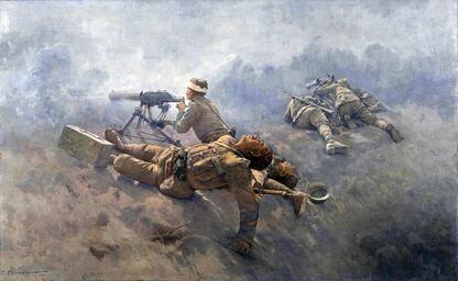 | Keywords: To the Last Man Prokopiou.jpg el έχρις Εσχάτων 1921 Γέώργιος Προκο ίου Συλλογή Εθνικής Τρά εζας της Ελλάδας Εικονίζονται Έλληνες Στρατιώτες κατά τις ε ιχειρήσεις της ικράς Ασίας το 1921 en To the Last Man έχρις Εσχάτων 1921 Georgios Prokopiou Gallery of the National Bank of Greece The painting depicts Greek infantrymen in Asia Minor 1921 during the Greco-Turkish War 2014-01-12 01 47 23 http //www gprokopiou gr/images/gallery/ETHNIKI-TRAPEZA-PROKOPIOU_MEXRIS-ESXATON jpg Creator Georgios Prokopiou PD-Art Uploaded with UploadWizard Greco-Turkish War 1919 1922 20th-century paintings Georgios Prokopiou People with machine guns |