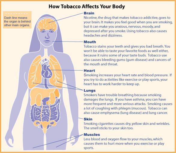 Keywords: Tobacco diagram.png Tell me more about it I really want to no that isn't enough en How tobacco affects your body Brain Nicotine the drug that makes tobacco addictive goes to your brain It makes you feel good when you are smoking but it can make you anxious nervous moody and depressed after you smoke Using tobacco also causes headaches and dizziness Mouth Tobacco stains your teeth and gives you bad breath You won't be able to taste your favorite foods as well either because some of your taste buds are ruined Tobacco use also causes bleeding gums gum disease and cancer Heart Smoking increases your heart rate and blood pressure If you try to do activities like exercise or play sports your heart has to work harder to keep up Lungs Smokers have trouble breathing because smoking damages the lungs If you have asthma you can have more frequent and more serious attacks Smoking causes a lot of coughing with phlegm mucous Tobacco can also increase emphysema lung disease and lung cancer Skin Smoking causes dry yellow skin and wrinkles The smell sticks to your skin too Muscles Less blood and oxygen flow to your muscles which causes them to hurt more when you exercise or play sports Content last updated March 28 2008 http //www girlshealth gov/substance/smoking/index cfm Office on Women's Health PD-USGov Smoking cessation Pulmonary emphysema Tobacco-related graphics