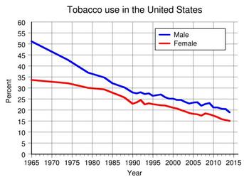 | Keywords: Tobacco use in the United States.svg translate yes en Tobacco use in the United States from 1965 to 2014 Data source http //www cdc gov/nchs/hus/contents2015 htm CDC Table 47 2016-05-16 own Delphi234 other versions current annually Generated with Wikimedia SVG Chart SVG Chart/box cc-zero Tobacco-related graphics Health in the United States |