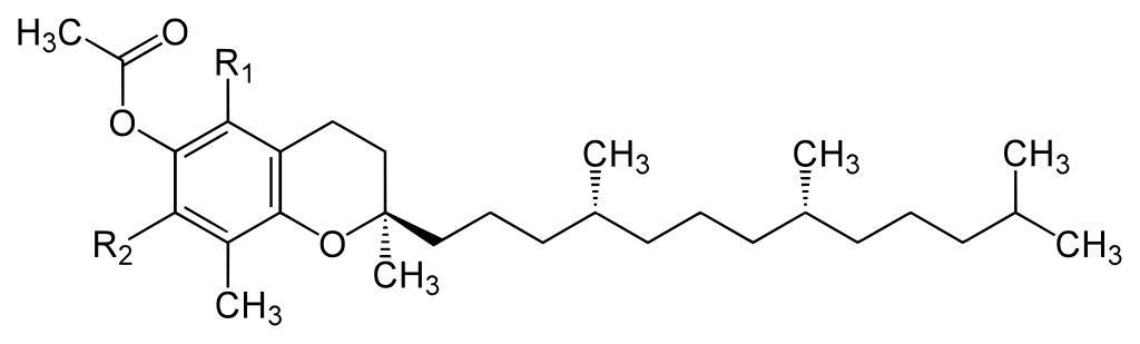 Keywords: Tocopheryl acetates.svg en Tocopheryl acetate<br> α R<sub>1</sub> R<sub>2</sub> CH<sub>3</sub>; β R<sub>1</sub> CH<sub>3</sub> R<sub>2</sub> H; γ R<sub>1</sub> H R<sub>2</sub> CH<sub>3</sub>; δ R<sub>1</sub> R<sub>2</sub> H de Tocopherylacetat Own Yikrazuul 2008-11-15 Acetate esters Vitamin E