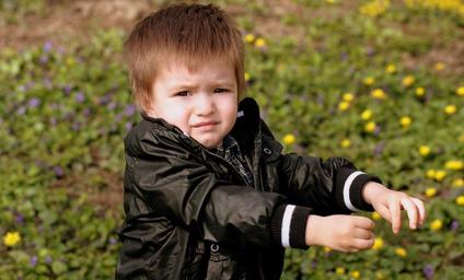 Keywords: toddler boy upset grass flowers nature innocence nice