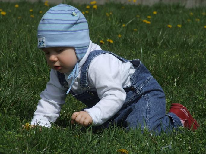 Keywords: toddler on the grass blue cap crawl
