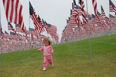 Keywords: toddler patriot patriotic girl running flags usa america stars and stripes lawn grass freedom young child kid happy cute childhood outdoor green park memorial day veterans day july 4th princess pink