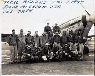 | Keywords: people outdoor SDASM.CATALOG: Yellin00005 SDASM.TITLE: Tokyo Raiders. First Mission for the 78th SDASM.DATE: 7-Apr-45 SDASM.ADDITIONAL INFORMATION: Top row to Bottom: Vandehey, Tapp; Heil, Duerr, Beyl, Roseberry, Yellin, Sherren (KIA July 8, 1945), D.B. Moore, R.E. Moore, Brookes, Evans, Collins; Chambers, Carr (July 8, 1945), Hostether, Hollan, Gautsche, Maher. Taken the day before Major Van left for the states. SDASM.COLLECTION: Papers of Jerome Yellin Special Collection SDASM.MEDIA: Glossy Photo SDASM.CATALOG: Yellin00005 SDASM.TITLE: Tokyo Raiders. First Mission for the 78th SDASM.DATE: 7-Apr-45 SDASM.ADDITIONAL INFORMATION: Top row to Bottom: Vandehey, Tapp; Heil, Duerr, Beyl, Roseberry, Yellin, Sherren (KIA July 8, 1945), D.B. Moore, R.E. Moore, Brookes, Evans, Collins; Chambers, Carr (July 8, 1945), Hostether, Hollan, Gautsche, Maher. Taken the day before Major Van left for the states. SDASM.COLLECTION: Papers of Jerome Yellin Special Collection SDASM.MEDIA: Glossy Photo |