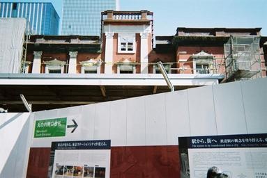 Keywords: Tokyo St. under repair 5.JPG ja 修理中の 京駅の中央改 口右側の屋根のある駅舎の部分に焦点を当てた写 own 神呼吸 2009-03-20 Restoration of Tokyo Station Marunouchi Building