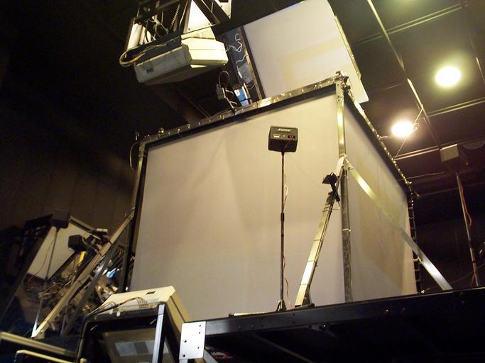 Keywords: Tokyo University CABIN 2.jpg Rear view of the CABIN at Tokyo University's Intelligent Modeling Laboratory The CABIN is a 5-screen CAVE system Visible here are the ceiling-mounted projector and mirror for images projected on the ceiling of the CABIN Own 1999-09-25 Dave Pape PD-user see also Image Tokyo_University_CABIN_1 jpg Davepape CABIN