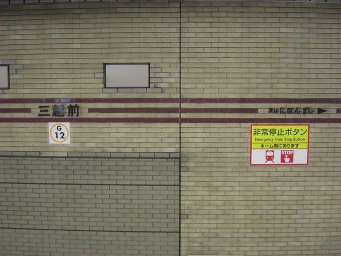 | Keywords: TokyoMetro-G12-Mitsukoshimae-station-sign.jpg  三越前駅 座線駅名標 Station sign of Mitsukoshimae Station  人撮影 2007-07-26 E231 original upload log wikitable date/time username resolution size edit summary ---- 13 05 26 July 2007 User 南 晃佑 3 648×2 736 4 6 MB <nowiki> 三越前駅 座線駅名標  人撮影 2007/7/26 E231  自身の 品かつ 全ての権利を放棄 パブリック・ドメイン   Own work all rights released other_versions</nowiki> original upload log wikitable date/time username resolution size edit summary ---- 2008-08-09T02 34 51Z User BetacommandBot 3648×2736 4 6Gb <nowiki>move approved by User Mike lifeguard This image was moved from Image CIMG0616 JPG ファイルの概要 三越前駅 座線駅名標  人撮影 2007/7/26 E231  自身の�</nowiki> Mitsukoshimae Station |