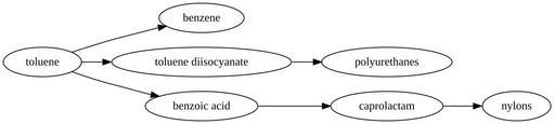 | Keywords: Toluene chemical production network.svg Petrochemical Produced using Graphviz Source code is below <pre>digraph G rankdir LR toluene -> benzene toluene -> toluene diisocyanate toluene diisocyanate -> polyurethanes toluene -> benzoic acid benzoic acid -> caprolactam caprolactam -> nylons </pre> own Mr3641 2010-10-25 Chemical processes Toluene |