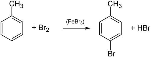 Keywords: Toluol (elektrophile Substitution HBr).png Elektrophile Substitution bei Toluol Own 2007-09-27 Yikrazuul Toluene Organic reactions