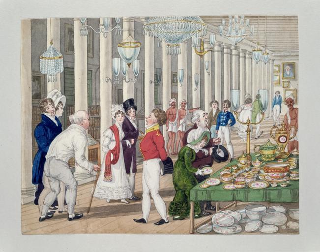 | Keywords: Tom Raw visits Taylor & Co.'s emporium in Calcutta.jpg en Sir Charles D'Oyly Bt was born in Calcutta in 1781 and after being educated in England returned to India in the service of the East India Company heading a fashionable group of Europeans devoted to artistic pursuits first in Calcutta and later in Patna where he was Opium Agent and later Commercial Resident D'Oyly was a man of boundless energy and social charm and he was also a skilled writer of light verse In 1828 he published a long poem called 'Tom Raw the Griffin' which he illustrated himself A griffin means a greenhorn someone who is new to India and unaccustomed to its ways This painting which in the end was not used in the published book illustrates Tom Raw's visit to Taylor Co 's emporium which sold European porcelain cut glass and many other imported goods and trinkets to the British inhabitants of Calcutta Fashionable ladies and gentlemen parade in the long colonnaded hall of the shop while Indian attendants look on Porcelain and crockery is stacked upon and below a table to the right while elaborate chandeliers hang from the ceiling circa 1828 made http //collections vam ac uk/item/O105773/painting-tom-raw-visits-taylor-cos/ Sir Charles D'Oyly born 1781 - died 1845 artist PD-old-100 Uploaded with UploadWizard Chandeliers in art 1828 cira 1820s fashion Sir Charles D'Oyly 7th Baronet Caricatures of India |