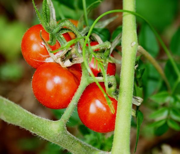 Keywords: tomatoes cherry tomatoes cocktail small round shiny red foliage green branches woody fruit edible