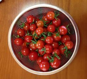 Keywords: Tomatoes in a punching metal bowl.jpg ja ざるに入ったプチトマト en Mini tomatoes in a punching metal bowl 2013-08-01 14 31 own Hahifuheho cc-zero Uploaded with UploadWizard Cherry tomato Holes Sieves