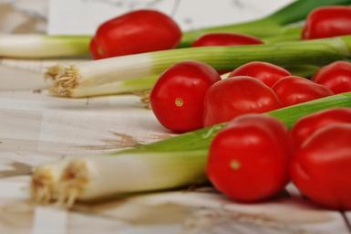 Keywords: tomatoes spring onions vegetables healthy vitamins frisch eat food bright red green bless you