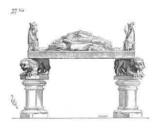 | Keywords: Tombe.Charles.le.Chauve.Saint.Denis.png Drawings by Eugène Viollet-le-Duc Tombs of the kings of France in Saint-Denis La tombe de Charles le Chauve placée au milieu du chœur des religieux de Saint-Denis et dont la fabrication paraît appartenir aux premières années du XIII<sup>e</sup> siècle était ainsi composée Nous en donnons fig 27 une copie d'après le bon dessin de la collection Gaignières L'empereur est représenté en demi-relief; sa tête repose sur un coussin ses pieds sur un lion La main droite tient le sceptre fleurdelisé la gauche une sphère Il est vêtu des trois robes les deux de dessus fendues sur le côté et du manteau rond attaché sur l'épaule droite; il porte la couronne fleuronnée Deux angelets placés dans les écoinçons du trilobe qui encadre la tête du prince tiennent des encensoirs et des navettes Aux quatre coins A de la plaque sont assises quatre statuettes d'évêques Une inscription en creux formait la bordure de la tombe Le fond de la plaque est entièrement émaillé en bleu avec fleurs de lis et réseau or Des plaques d'émail incrusté décoraient aussi les bordures des robes et du manteau Quatre lions de bronze reposant sur des colonnettes jumelles très-courtes de pierre supportaient cette table voyez l'élévation fig 27 <i>bis</i> laissant un vide de 0<sup>m</sup> 55 environ au-dessous d'elle Dictionnaire raisonné de l'architecture française du XI<sup>e</sup> au XI<sup>e</sup> siècle ~ 1856 Eugène Viollet le Duc Viollet-le-Duc |