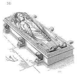 | Keywords: Tombeau.cathedrale.Amiens.png Drawings by Eugène Viollet-le-Duc Nous ne possédons plus en France que quatre tombes de métal dans le genre de celle de Charles le Chauve Deux sont sans émaux ce sont les tombes des évêques d'Amiens Ewrard de Fouilloy et Godefroy; l'un de ces deux monuments est d'une grande valeur comme art c'est celui de l'évêque Ewrard La tête les draperies admirablement modelées sont d'un style excellent Nous donnons fig 28 une copie de ce tombeau Le personnage demi ronde bosse est fondu avec la plaque et la table repose sur un socle de pierre très-bas avec six lions issants L'évêque bénit et porte la crosse Deux anges thuriféraires en bas-relief encensent sa tête qui repose sur un coussin richement décoré Deux clercs également en bas-relief tiennent des flambeaux Les pieds du prélat reposent sur deux dragons Une inscription et un bel ornement courant enveloppent la igure encadrée par une sorte de dais à sa partie supérieure L'évêque Ewrard de Fouilloy fut le fondateur de la cathédrale actuelle d'Amiens commencée en 1220 Il mourut en 1223; donc son tombeau placé autrefois à l'entrée de la nef dans l'axe date de la première moitié du XIII<sup>e</sup> siècle; il possède d'ailleurs tous les caractères de cette époque Dictionnaire raisonné de l'architecture française du XI<sup>e</sup> au XI<sup>e</sup> siècle ~ 1856 Eugène Viollet le Duc Viollet-le-Duc |