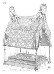 | Keywords: Tombeau.eglise.Villeneuve.png Drawings by Eugène Viollet-le-Duc Nous avons la preuve de cette dernière disposition dans les magnifiques tombeaux de cuivre doré et émaillé qui se voyaient avant 1793 dans l'église de Villeneuve près de Nantes et dont les dessins nous sont conservés dans la collection de Gaignières L'un de ces monuments élevé sur la sépulture de deux princesses qui sont Alix comtesse de Bretagne morte en 1221 et sa fille Yolande de Bretagne qui mourut en 1212 date de cette dernière époque Le vêtement de la comtesse Alix appartient même aux années comprises entre 1225 et 1235 Cette figure était-elle déjà faite alors ou le statuaire voulut-il reproduire le costume de la princesse morte en 1221 Nous ne pourrions décider la question; cependant on peut admettre que la statue d'Alix était faite après sa mort ainsi que la plaque sur laquelle on l'avait fixée car l'ornementation émaillée de cette plaque est évidemment plus ancienne que celle de Yolande et qu'après la mort de celle-ci les deux tombes furent encadrées dans un même socle Quoi qu'il en soit sur les bordures armoyées qui entourent et séparent les deux plaques sont disposées douze <i>douilles</i> en forme de fleurettes fermées qui étaient destinées évidemment à recevoir des bobèches et des cierges ainsi que l'indique notre figure 29 Les socles très-bas de la tombe jumelle sont également couverts d'émaux armoyés Aux angles sont quatre lions issants de bronze doré Le tout reposait sur une marche de pierre Dictionnaire raisonné de l'architecture française du XI<sup>e</sup> au XI<sup>e</sup> siècle ~ 1856 Eugène Viollet le Duc Viollet-le-Duc |