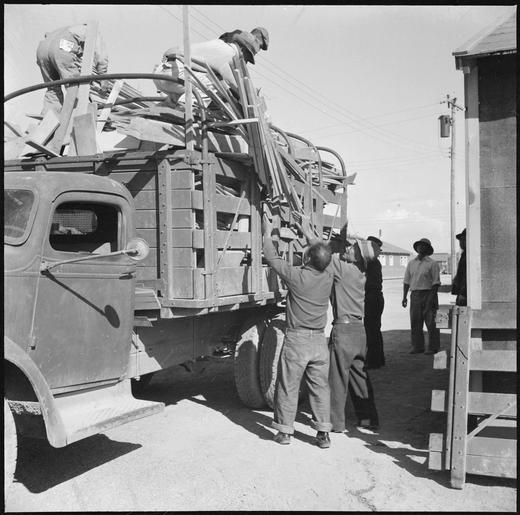 | Keywords: Topaz, Utah. Volunteer workers delivering scrap wood to be used as kindling at barracks at the Topa . . . - NARA - 538704.tif Scope and content The full caption for this photograph reads Topaz Utah Volunteer workers delivering scrap wood to be used as kindling at barracks at the Topaz Relocation Center General notes 538704 Local identifier 210-G-E39 Department of the Interior War Relocation Authority 02/16/1944 - 06/30/1946 NARA-Author Parker Tom Photographer 4682167 <br /> Still Picture Records Section Special Media Archives Services Division NWCS-S National Archives at College Park 8601 Adelphi Road College Park MD 20740-6001 1942-10-18 Record group Record Group 210 Records of the War Relocation Authority 1941 - 1989 Record group ARC 537 Central Photographic File of the War Relocation Authority compiled 1942 - 1945 Series ARC 536000 File unit File unit ARC Variant control numbers NAIL Control Number NWDNS-210-G-E39 yes Other versions <gallery> File Topaz _Utah _Volunteer_workers_delivering_scrap_wood_to_be_used_as_kindling_at_barracks_at_the_Topa_ _ _ _-_NARA_-_538704 tif tif File Topaz _Utah _Volunteer_workers_delivering_scrap_wood_to_be_used_as_kindling_at_barracks_at_the_Topa_ _ _ _-_NARA_-_538704 jpg jpg </gallery> NARA-cooperation PD-USGov NARA TIF images with categorized JPGs Topaz War Relocation Center |