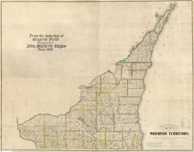 | Keywords: Topographical Map of Wisconsin Territory WDL6769.png Artwork ru Висконсин Комиссия по общественным землям fr Wisconsin Conseil des commissaires des terres publiques en Wisconsin Board of Commissioners of Public Lands zh 威斯康星州公共 委员会 Wisconsin Board of Commissioners of Public Lands pt Wisconsin Conselho de Comissários de Terras Públicas ar ويسكونسن مجلس مفوضي الأراضي العامة es Wisconsin Junta de comisionados de tierras públicas ru Топог афическая ка та Те ито ии Висконсин fr Carte topographique du territoire du Wisconsin en Topographical Map of Wisconsin Territory zh 威斯康辛 区 形图 pt Mapa Topográfico do Território de Wisconsin ar الخريطة الطبوغرافية لمقاطعة ويسكونسن ru Это пе вая к упномасштабная ка та Те ито ии Висконсин составленная на основе конту ных съемок Ка ту составили и опубликовали топог афы Сэмюэл о исон Элиша Двэлль и Джошуа Хатэуэй Г ави ование выполнено на т ех медных печатных фо мах В 1785 г Конг есс Соединенных Штатов Аме ики п инял постановление о межевании земли в кото ом была п едусмот ена система тауншипов участков госуда ственного межевания в виде квад атов со сто оной шесть миль поделенных на 36 участков площадью в одну кв милю а ка те показаны тауншипы Те ито ии Висконсин азмежеванные к 1837 г а ка те также обозначены до оги т опы естественные фо мы ельефа астительность места асположения мельниц известные в то в емя место ождения свинца и меди Длинные участки земли в Г ин-Бей и П ей и-дю-Чиен от ажают ф анцузскую систему землевладения п инятую вдоль бе егов ек Ка ты аналогичные этой помогали пе еселенцам и колонистам понять систему межевания и оп еделить местоположение участка земли кото ый они покупали Потенциальный покупатель мог пойти в любую госуда ственную конто у егист и ующую земельные сделки и посмот еть планы земельных участков с под обным описанием земли Как следует из да ственной надписи ка та одно в емя п инадлежала аме иканскому писателю Юджину Филду 1850 1895 гг <br>Топог афические ка ты s détaillées du territoire Comme l'indique l'inscription la carte a appartenu auparavant à l'écrivain américain Eugene Field 1850-1895 <br>Cartes topographiques s of the land As the inscription states the map once belonged to the American writer Eugene Field 1850 95 <br>Topographic maps zh 这是第 幅根据实测数据绘制的威斯康辛 区大幅 图 该 图由勘测师塞缪尔·莫里森 Samuel Morrison 以利沙· 韦乐 Elisha Dwelle 和乔舒亚·哈瑟维 Joshua Hathaway 收集资料并出版,刻 三 版上 1785 年,美国国会 过 测量法令 Land Survey Ordinance ,推出正方形镇区制度,规定镇区边长为六英里,划分为 36 ,每 积为 平方英里 该 图显示了威斯康辛 区 1837 年之前测量的镇区,还绘出了街道 小路 天然 形 植被 工厂以及当时探明的铅 矿藏 格林湾和普雷里德欣的长 反映了沿河 带的法式 持 制度 当时,这类 图帮助移民和定居 了解了测量制度并找到自己购买的 意购买 可前 美国政 管理 ,查阅包含 情况详细描述的 簿册 按照 图上的题词 述,该 图曾 度属于美国 家尤金·菲尔德 Eugene Field (1850 95 年) <br> 形图 pt Este é o primeiro mapa em grande escala do Território de Wisconsin com base em pesquisas reais O mapa foi compilado e publicado pelos pesquisadores Samuel Morrison Elisha Dwelle e Joshua Hathaway e gravado em três placas de cobre Em 1785 o Congresso dos Estados Unidos aprovou a Portaria de Estudos Terrestres que previa um sistema de municípios quadrados de seis milhas de lado divididos em 36 seções de um quilômetro quadrado O mapa apresenta municípios do Território de Wisconsin pesquisados em 1837 Também estão descritos estradas trilhas formas naturais da terra vegetação moinhos e os depósitos de chumbo e cobre conhecidos na época Os extensos lotes em Green Bay e Prairie du Chien refletem o sistema francês de posse de terra ao longo das margens dos rios Mapas como estes ajudaram os imigrantes e colonizadores a compreender o sistema de levantamento e a localizar as terras adquiridas Um potencial comprador poderia se dirigir a qualquer Escritório de Registro da Terra do Governo dos EUA e consultar os trechos dos livros que continham descrições detalhadas da terra Conforme aponta a inscrição o mapa já pertenceu ao escritor norte-americano Eugene Field 1850-95 <br>Mapas topográficos ar هذه هي أول خريطة كبيرة الحجم لمقاطعة ويسكونسن بناء على عمليات مسح حقيقية وقد جمع المساحون صامويل موريسون و إليشا دويل و جوشوا هاثواي الخريطة وقاموا بنشرها ونقشها على ثلاثة ألواح نحاسية في عام 1785، مرر الكونجرس الأمريكي قانون مسح الأ