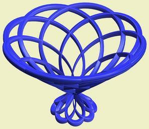 | Keywords: mathematica 3d cg parametricplot3d texture torus code program algorithm プログラム コード アルゴリズム 輪環 りんかん ドーナツ どーなつ lissajous リサージュ geometric sculpture geometricsculpture shape geometry sculpture mapping テクスチャ マッピング 模様 もよう design pattern デザイン パターン graphic グラフィック グラフィクス structure 意匠 構造 symmetry 対称性 たいしょうせい シンメトリー 対称 たいしょう white background round circle a = 8; (* center hole size of a torus *) b1 = 8;(* number of cross *) b2 = 9;(* number of cross *) c = 0; (* distance from the center of rotation *) d = 1; (* number of torus *) w = 16; (* gap width *) SetOptions[ParametricPlot3D, PlotRange -> Full, Mesh -> None, Boxed -> False, Axes -> None, PlotPoints -> 800, ImageSize -> 2400, Background ->RGBColor[{240, 240, 200}/255], PlotStyle -> Directive[Specularity[White, 90], Texture[Import["D:/tmp/713.jpg"]]], TextureCoordinateFunction -> ({#4, #5/Pi} &), Lighting -> "Neutral"]; f[v_] := Sin[2 Sin[Sin[Sin[v]]]]; x = (a - Cos[t] + w Sin[b1 s]) Cos[b2 s] + c; y = (a - Cos[t] + w Sin[b1 s]) Sin[b2 s] + c; z = w Sin[b1 s] + f[t] + c; rm = Table[{x, y, z}.RotationMatrix[2 i Pi/d, {0, 1, 2}], {i, d}]; ParametricPlot3D[rm, {t, 0, 2 Pi}, {s, 0, 2 Pi}] (*--- The Texture *) a = 8; (* center hole size of a torus *) b1 = 8;(* number of cross *) b2 = 9;(* number of cross *) c = 0; (* distance from the center of rotation *) d = 1; (* number of torus *) w = 16; (* gap width *) SetOptions[ParametricPlot3D, PlotRange -> Full, Mesh -> None, Boxed -> False, Axes -> None, PlotPoints -> 800, ImageSize -> 2400, Background ->RGBColor[{240, 240, 200}/255], PlotStyle -> Directive[Specularity[White, 90], Texture[Import["D:/tmp/713.jpg"]]], TextureCoordinateFunction -> ({#4, #5/Pi} &), Lighting -> "Neutral"]; f[v_] := Sin[2 Sin[Sin[Sin[v]]]]; x = (a - Cos[t] + w Sin[b1 s]) Cos[b2 s] + c; y = (a - Cos[t] + w Sin[b1 s]) Sin[b2 s] + c; z = w Sin[b1 s] + f[t] + c; rm = Table[{x, y, z}.RotationMatrix[2 i Pi/d, {0, 1, 2}], {i, d}]; ParametricPlot3D[rm, {t, 0, 2 Pi}, {s, 0, 2 Pi}] (*--- The Texture *) |
