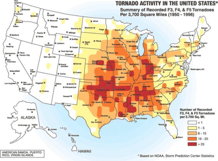 Keywords: Tornado Alley.png A map of the frequency of F3 and greater intensity tornadoes by area The darker colors highlight the area typically known as Tornado Alley Source Image from a booklet from http //www fema gov/index shtm Federal Emergency Management Agency a United States government agency titled http //www fema gov/plan/prevent/saferoom/tsfs02_torn_activity shtm Taking Shelter from the Storm Building a Safe Room Inside your House FEMA 320 Figure 1 1 page 3 and thought to be in the public domain Area 700x522 pix PD-USGov Maps of North Americian tornadoes |
