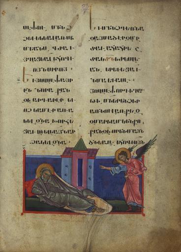 | Keywords: T'oros Roslin - Joseph's Dream - Google Art Project.jpg ink paint and gold on parchment Priest T'oros nephew of the catholicos Constantine I Hromkla Armenia between 1262 and 1266; Hermitage of Ark'-akaghin Cilicia Armenia 1266 mode of acquisition unknown; Ter Tiratur Sebastia Armenia 1604 mode of acquisition unknown; Church of the Holy Virgin Sebastia Armenia between 1626 and 1881 mode of acquisition unknown; Church of the Holy Cross Sebastia Armenia beween 1881 and 1915 mode of acquisition unknown; Dikran Kelekian Paris date and mode of acquisition unknown; Henry Walters New York 1929 by purchase; Sadie Jones Mrs Henry Walters New York 1931 by bequest; Walters Art Museum 1935 by bequest special url_id PAGscMWM1vk_iA PD-old-100-1923 1268 Google Art Project works by T'oros Roslin Walters MS W539 - Toros Roslin Gospels Dream of Joseph Armenian erkatagir manuscripts |