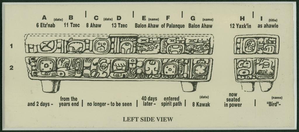 | Keywords: Tortuguero Box WDL2658.jpg  Artwork ru Ко обка из То туге о fr Boîte à offrande de Tortuguero en Tortuguero Box zh 托尔图格罗之盒 pt Caixa de Tortuguero ar صندوق تورتوغيرو ru Этот п едмет называется ящиком То тугуе о поскольку надписи на нем сопоставимы с п едметами обна уженными в То тугуе о   ексика Он п едставляет собой миниатю ный ящик для подношений  один из немногих дошедших до наших дней п едметов личного обихода на ода майя сделанных из де ева По т ет в полный  ост вождя майя изоб аженный на к ышке ящика и 44 ие оглифических символа  ассказывают исто ию кото ая помогает многое понять в социальной системе на ода майя Повествование начинается с изоб ажения владельца ящика Адж Какс Бахлама кото ый занимал важное положение п и дво е Ик  уйил  уваахна II  ко оля То тугуе о  ногие ие оглифы сте лись что зат удняет понимание отдельных частей исто ии но в сох анившейся в пе воначальном виде части текста п иведены имена и даты кото ое позволили частично пе евести этой майяский текст Текст п одолжается на левой сто оне и в нем упоминается сме ть д угого п авителя  Бахлама Ажавы Далее в тексте связывается сме ть Бахлама Ажавы и восхождение на п естол его сына Ик  уйил  уваахна II че ез 41 день В д угих ф азах упоминается что Ик  уйил  уваахн II был тезкой своего деда а также факт официального возведения Адж Какс Бахлама в должность птичей главы 8 ма та 680 года В конце текста п иводится дата создания ящика 14 октяб я 681 года и он называется <i> йотут майиж </i> <i> </i>или ко обка для подношений самого<i> </i>Адж Какс Бахлама <br>Ие оглифы; Ко оли и п авители;  айя; Знаки и символы; Письмо -- Исто ия fr Cet objet appelé boîte de Tortuguero en raison des inscriptions comparables à celles trouvées à Tortuguero au Mexique est une petite boîte d'offrandes l'un des rares objets en bois de l'empire Maya ayant résisté au temps Ce portrait en pied d'un seigneur Maya sur le couvercle de la boîte et les 44 signes hiéroglyphiques qui y figurent racontent une histoire qui apporte un éclairage important sur le système social maya Le récit commence avec l'image du propriétaire de la boîte Aj K'ax B'ahlam titulaire d'un poste important sous le patronage du roi Tortuguero Ik 'Muyil Muwaahn II Beaucoup de glyphes sont érodées obscurcissant une partie de l'histoire mais les parties lisibles indiquent des noms et dates ayant permis une traduction partielle du texte Maya Le texte continue sur la partie gauche mentionnant la mort d'un autre dirigeant B'ahlam Ajaw Le récit se poursuit en liant la mort de B'ahlam Ajaw à l'accession au trône de son fils Ik 'Muyil Muwaahn II 41 jours plus tard D'autres phrases identifient le terme Ik 'Muyil Muwaahn II comme l'homonyme de son grand-père et se référant à l'investiture de Aj K'ax B'ahlam à la fonction de chef des oiseaux le 8 Mars 680 Le texte se termine par la date de réalisation de la boîte 14 Octobre 681 et la désigne <i>yotoot mayij</i> <i> </i>ou boîte d'offrandes d'Aj K'ax B'ahlam<i> </i>lui-même <br>Hiéroglyphes; Rois et dirigeants; Mayas; Signes et symboles; Écriture - Histoire en This object called the Tortuguero box because its inscriptions are comparable to those found in Tortuguero Mexico is a diminutive offering box one of very few surviving Mayan personal objects made of wood The full-length portrait of a Mayan lord on the cover of the box and the 44 hieroglyphic signs tell a story that yields important insights into the Mayan social system The narrative begins with the image of the box s owner Aj K'ax B'ahlam the holder of an important position under the patronage of the Tortuguero king Ik' Muyil Muwaahn II Many of the glyphs are eroded thereby obscuring part of the story but the legible areas show names and dates that have allowed for a partial translation of the Mayan text The text continues on the left side mentioning the death of a different ruler B'ahlam Ajaw The narrative continues by linking the death of B'ahlam Ajaw to the accession of his son Ik' Muyil Muwaahn II 41 days later Other phrases identify Ik' Muyil Muwaahn II as the namesake of his grandfather and refer to the investiture of Aj K'ax B'ahlam into the head bird office on March 8 680 The text concludes with the date the box was made October 14 681 and refers to it as the <em>yotoot mayij</em> <em> </em>or offering container of Aj K'ax B'ahlam<em> </em>himself <br>Hieroglyphs; Kings and rulers; Mayas; Signs and symbols; Writing--History zh 该用具是 种小型捐献箱,因为它的铭文可与 墨西哥托尔图格罗发现的文物相媲美,因此也称为 托尔图格罗盒 ,是目前 存下 的 种 常罕见的玛雅人 质用具  盒盖上玛雅领主的全身像以及 44 个象形符号告诉人们 个能够深刻洞察玛雅社会制度的故事  故事始于盒子的主人 艾洁·卡克布斯