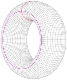 | Keywords: Torus cycles2.svg torus Radius of magenta circle is <math>R 15</math> and radius of red circle is <math>r 5</math> Image created in maxima with gnuplot backend and subsequently cropped manually using a text editor 2014-04-15 13 32 31 own Krishnavedala 150px valid SVG gnuplot This plot was created using maxima with gnuplot backend <syntaxhighlight lang gnuplot > load draw R 15; r 5; eps 0 05; x R + r cos phi cos theta ; y R + r cos phi sin theta ; z r sin phi ; draw3d terminal svg file_name Torus2 xtics none ytics none ztics none axis_3d false view 90 330 xu_grid 50 yv_grid 100 surface_hide true color black enhanced3d false wired_surface true color gray line_width 0 5 parametric_surface z y x phi - pi pi theta - pi pi color red line_width 1 parametric r+eps sin t 0 R + r+eps cos t t - pi pi color magenta parametric -r R sin t R cos t t - pi pi xrange -20 20 ; </syntaxhighlight> cob cc-zero Torus Fundamental group SVG mathematics Images with Maxima CAS source code |
