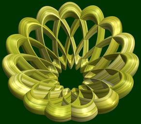 | Keywords: mathematica 3d cg parametricplot3d texture torus code program algorithm プログラム コード アルゴリズム 輪環 りんかん ドーナツ どーなつ lissajous リサージュ geometric sculpture geometricsculpture shape geometry sculpture mapping テクスチャ マッピング 模様 もよう abstract 抽象 ちゅうしょう アブストラクト design pattern デザイン パターン graphic グラフィック グラフィクス structure 意匠 構造 symmetry 対称性 たいしょうせい シンメトリー 対称 たいしょう black background organic pattern bright a = 6; (* center hole size of a torus *) b1 = 15;(* number of cross *) b2 = 4;(* number of cross *) c = 0; (* distance from the center of rotation *) d = 1; (* number of torus *) w = 3; (* gap width *) SetOptions[ParametricPlot3D, PlotRange -> Full, Mesh -> None, Boxed -> False, Axes -> None, PlotPoints -> 500, ImageSize -> 3000, Background -> Darker[Green, 0.8], PlotStyle -> Directive[Specularity[White, 90], Texture[Import["D:/tmp/71.jpg"]]], TextureCoordinateFunction -> ({#4 + #5, #5/Pi} &), Lighting -> "Neutral"]; f[v_] := Sin[2 Sin[Sin[Sin[v]]]]; x = (a - Cos[t] + w Sin[b1 s]) Cos[b2 s] + c; y = (a - Cos[t] + w Sin[b1 s]) Sin[b2 s] + c; z = w Sin[b1 s] + f[t] + c; rm = Table[{x, y, z}.RotationMatrix[2 i Pi/d, {0, 0, 1}], {i, d}]; ParametricPlot3D[rm, {t, 0, 2 Pi}, {s, 0, 2 Pi}] (*--- The Texture *) a = 6; (* center hole size of a torus *) b1 = 15;(* number of cross *) b2 = 4;(* number of cross *) c = 0; (* distance from the center of rotation *) d = 1; (* number of torus *) w = 3; (* gap width *) SetOptions[ParametricPlot3D, PlotRange -> Full, Mesh -> None, Boxed -> False, Axes -> None, PlotPoints -> 500, ImageSize -> 3000, Background -> Darker[Green, 0.8], PlotStyle -> Directive[Specularity[White, 90], Texture[Import["D:/tmp/71.jpg"]]], TextureCoordinateFunction -> ({#4 + #5, #5/Pi} &), Lighting -> "Neutral"]; f[v_] := Sin[2 Sin[Sin[Sin[v]]]]; x = (a - Cos[t] + w Sin[b1 s]) Cos[b2 s] + c; y = (a - Cos[t] + w Sin[b1 s]) Sin[b2 s] + c; z = w Sin[b1 s] + f[t] + c; rm = Table[{x, y, z}.RotationMatrix[2 i Pi/d, {0, 0, 1}], {i, d}]; ParametricPlot3D[rm, {t, 0, 2 Pi}, {s, 0, 2 Pi}] (*--- The Texture *) |