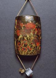 | Keywords: Toryu - Inro with Autumn Carnations and Badger Netsuke - Walters 67425.jpg A standard oblong black lacquer five compartment inro Flowering pinks or carnations all around in hiramakie of gold and silver with togidashiji The flowers in red lacquer The background in roiro The interior in nashiji and fundame Inscribed in gold with a gold kakihan on the bottom of the bottom compartment The cord channels are external Together with a carved wood netsuke in the form of a badger with a drum and with a signature Toryu carved on the bottom of the tail late Other date century 18 Edo lacquer coral wood inro cm 8 3 5 2 2 4 accession number 67 425 28355 Wakai Kanesaburo Centennial Exhibition Philadelphia 1876 William T Walters city Baltimore Henry Walters city Baltimore Walters Art Museum Henry Walters Acquired by William T Walters 1876 Signature Toyo kakihan ; Signature Iizuka Toyo; Signature Toryu Centennial Exhibition Philadelphia Memorial Hall Philadelphia Philadelphia 1876 Netsuke Miniature Sculpture of Japan place of origin Edo present-day Tokyo Japan Walters Art Museum license Netsuke Miniature Sculpture of Japan Art of Japan in the Walters Art Museum Media from the Walters Art Museum no creator template Media contributed by the Walters Art Museum needs category review |