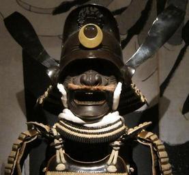 | Keywords: Tosei gusoku armor with white lacing and Chinese magistrate's cap helmet (head).JPG en Tōsei gusoku armor with white lacing and Chinese magistrate's cap helmet 18th century Japan iron metal lacquer silk gold and deerskin own Haa900 photo 2013 Kabuto Cc-zero |