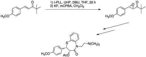 | Keywords: Total Synthesis of Diltiazem6.png en The Juliá-Colonna Epoxidation has been applied to the Total Synthesis of Diltiazem „¢ From Adger B M ; Barkley J V ; Bergeron S ; Cappi M W ; Flowerdew B E ; Jackson M P ; McCague R ; Nugent T C ; Roberts S M Improved procedure for Julia-Colonna asymmetric epoxidation of α β-unsaturated ketones total synthesis of diltiazem and Taxol TM side-chain J Chem Soc -Perkin Trans 1 1997 23 3501-3507 own C rose kennedy Total syntheses Drug syntheses Diltiazem Juliá-Colonna epoxidation |