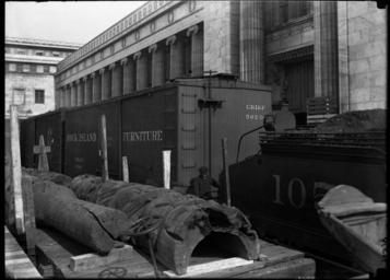 | Keywords: the field museum columbian move blackandwhite monochrome black and white Totem poles on Rock Island Line train car marked with the word "Furniture" and Engine #105 visible, outside Field Museum building, ready to move into new building. Museum move series. 1920. Original size and material: 5x7 inch glass negative Digital Identifier: CSGN40519 Part of the Illinois Urban Landscapes Project: www.fieldmuseum.org/urbanlandscapes/ Totem poles on Rock Island Line train car marked with the word "Furniture" and Engine #105 visible, outside Field Museum building, ready to move into new building. Museum move series. 1920. Original size and material: 5x7 inch glass negative Digital Identifier: CSGN40519 Part of the Illinois Urban Landscapes Project: www.fieldmuseum.org/urbanlandscapes/ |