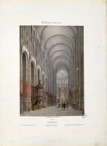 Keywords: Toulouse - Intérieur de St. Sernin - Fonds Ancely - B315556101 A MERCEREAU 7 046.jpg Impression en 3 coul par Frick frères à Paris Fait partie d'un ensemble de recueils de lithographies de Mercereau composés de lithographies provenant de La France de nos jours vaste suite publiée par livraisons de 1853 à 1876 et comprenant 475 planches en deux tirages l'un à deux teintes noir et bistre l'autre en couleurs Les libraires ont réuni ces planches en albums de composition variable quant au nombre de planches et aux dessinateurs Asselineau Mercereau Maurice Deroy etc Un titre Les Pyrénées par Ch Mercereau; Bagnères-de-Luchon par Ch Mercereau était frappé sur le plat supérieur de la reliure de l'album ainsi que le nom du Libraire pour lequel il était réalisé La plupart des recueils de ces planches pyrénéennes portent le nom de Sajous libraire à Bagnères-de-Luchon Pl 1 à 18 numérotées de 370 à 386 Pl 374 pl 5 et 6 en double -- Pl 19 20 et 21 numérotées respectivement 407 415 et 418 Ces trois pl ont été dessinées et lithographiées par Asselineau -- Pl 22 23 et 24 numérotées 438 439 et 440 -- Pl 22 lith par Aubrun -- Pl 25 numérotée 441 -- Pl 26 à 40 numérotées de 327 à 341 -- Pl 41 à 46 numérotées de 363 à 368 -- Pl 47 numérotée 369 -- Pl 48 num 292 -- Pl 49 et 50 num 264 et 265 -- Pl 51 et 52 num 268 et 269 -- Pl 53 à 55 num de 293 à 295 -- Pl 56 num 300 -- Pl 57 à 59 num de 307 à 309 -- Pl 60 à 70 num de 316 à 326 -- Pl 71 num 63 dessin et lith d'Asselineau imprimerie Destouches -- Pl 72 et 73 num 87 et 88 dessin et lith d'Asselineau imprimerie Destouches -- Pl 74 num 124 signée Lebreton éditée chez Lalonde à Paris et imprimée chez Becquet frères à Paris -- Pl 75 num 161 dessin et litho d'Asselineau imprimerie Destouches --Pl 76 à 78 num de 207 à 209 -- Pl 79 à 81 num de 211 à 213 -- Pl 82 num 220 dessin et lith de Maurice imprimerie Destouches -- Pl 83 à 86 num de 226 à 229 -- Pl 87 et 88 num 234 et 235 -- Pl 89 à 91 num de 273 à 275 -- Pl 92 et 93 num 290 et 291 Pièces jointes 6 pl sépia dont certaines sont des doubles du recueil de Mercereau Les cinq premières planches sont numérotées respectivement 318 321 324 331 386 La dernière planche n'est pas extraite de La France de nos jours mais de L'Espagne pittoresque et monumentale Ces six planches sont signées Mercereau éditées chez Sinnet et imprimées chez Frick frères Ancely René 1876 - 1966 Possesseur fre public domain domaine public B315556101_A_MERCEREAU_7_046 jpg image/jpeg 1 f de pl lithogr ; 43 cm Frick frères Imprimeur Sinnet F Éditeur http //numerique bibliotheque toulouse fr/collect/general/index/assoc//ark /74899/B315556101_A_MERCEREAU_7_046 dir/B315556101_A_MERCEREAU_7_046 jpg Bibliothèque municipale de Toulouse A-MERCEREAU 7-46 Creator Charles Mercereau http //catalogues toulouse fr/web2/tramp2 exe/do_keyword_search/log_in setting_key BMT1 servers 1home query p001670 St Jean-de-Luz intérieur de l'Eglise St Jean-de-Luz le Château de l'Infante Biarritz Vue générale prise du Phare Château de Mauvesin près Bagnères-de-Bigorre Hautes Pyrénées Bagnères de Bigorre Hautes Pyrénées - Intérieur de l'Eglise des Carmes en couleurs Bagnères de Bigorre Hautes Pyrénées - Intérieur de l'Eglise des Carmes Bagnères-de-Bigorre - Eglise et couvent des Carmes Bagnères-de-Bigorre Hautes-Pyrénées - Tour des Jacobins Cascade et Pont de Magenta Vallée de l'Esponne Hautes Pyrénées Cascade de Trémes-Aïgues Vallée de Grip Hautes Pyrénées St Sauveur Hautes Pyrénées - Le Pont Napoléon Bayonne - Eglise St André Arreau et la Vallée d'Aure Hautes Pyrénées - Vue prise au dessus de la route du Col d'Aspin Auch - Vue prise sur les bords du Gers Auch - Vue de la Cathédrale Auch - Intérieur de la Cathédrale Bagnères-de-Bigorre - Vue Générale prise de la Fontaine ferrugineuse Eaux-Bonnes Basses-Pyrénées - L'établissement Thermal et la Chapelle Nantes - Vue de l'Eglise Ste Croix Le Croisic - Plage des Baigneurs et Etablissement de Bains Le Folgoët - Vue de l'Eglise Brèche de Roland prise de Gèdres Hautes Pyrénées Eglise des Templiers à Luz Chapelle du couvent de Pouëlahun i e Pouey Lahun - Vallée d'Azun Hautes Pyrénées Le Pont de Scia - Route de Luz à Gavarnie Hautes-Pyrénées Vue de l'établissement de la Raillière près Cauterets Hautes-Pyrénées Vue générale de Cauterets prise du Mamelon Vert Hautes-Pyrénées Vue du Fort de Lourdes Hautes-Pyrénées Vue d'Argelès-de-Bigorre Hautes-Pyrénées Vue de St Sauveur Hautes-Pyrénées Le Pas de l'Echelle Route de Gavarnie Hautes-Pyrénées Fond de la Vallée d'Argelès prise de la terrasse de St Savin Hautes-Pyrénées Place Grammont à Pau Basses-Pyrénées Vue générale des Eaux-Bonnes Basses-Pyrénées Barèges et la Vallée du Bastan Hautes-Pyrénées Chute supérieure du Pont d'Espagne Hautes-Pyrénées La grotte miraculeuse à Lourdes Hautes-Pyrénées Eglise de Bétharram et Pont de Lestelle Basses Pyrénées Cascade du Cerizet Près Cauterets Hautes-Pyrénées Pic du Midi d'Ossau 2885m Basses Pyrénées - Vue prise du 3e plateau de Bious-Artigues Toulouse - Cloître du Musée et Clocher des Augustins Pau - Vue prise de la terrasse du Château Pau - Vue du Château prise du Parc Toulouse - Cloître du Musée Galerie du Moyen-Age Toulouse - La maison de pierre fragment de la façade St Jean-de-Luz Fort du Socoa Toulouse - Vue du Capitole Bordeaux Vue de la Porte du Caillau i e Cailhau Bordeaux Porte de la grosse Cloche Bordeaux Vue des Quinconces Bordeaux - Vue de la Tour et de l'Eglise de St Michel Toulouse - Vue du Pont de pierre prise du Quai de Brienne Toulouse - Abside de l'Eglise de St Sernin de l'an 1097 Toulouse - Choeur de la Cathédrale St Etienne Rouen - Hôtel de Bourgtheroulde Biarritz - Vue des Bains Napoléon et du Casino Biarritz - Vue des Bains du Port Vieux Biarritz - Vue de l'Entrée de la Ville à l'arrivée de Bayonne Le Lac Bleu Hautes-Pyrénées 