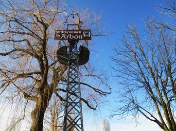 Keywords: tower iron construction welcome lettering coat of arms bell boat harbour trees sky blue ambience arbon thurgau switzerland