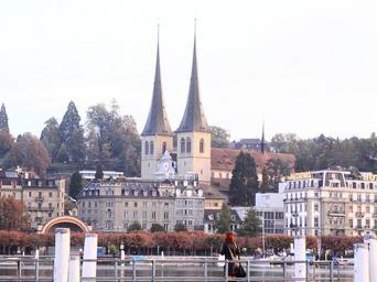Keywords: tower spire church lake building water surface switzerland lucerne women morning views