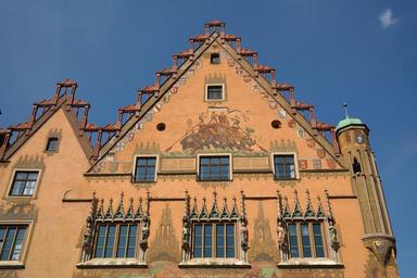 Keywords: town hall ulm window facade painting ulmer hall frescoes mural yellow monument early renaissance secco painting coat of arms gable