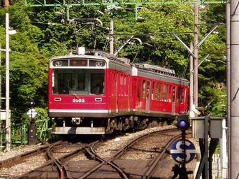 Keywords: Tozan St.Moritz 2003 Ohiradai.jpg en Hakone Tozan Railway EMU Type 2000 St Moritz 35 238794 139 074236 heading SE Hakone Tozan 2000 series