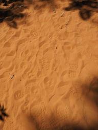 Keywords: traces sand tracks in the sand footprints yellow orange ochre colours shoe print shoe sole imprint sole imprint sand road