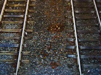Keywords: track bed gleise seemed railroad track gravel railway rail traffic pebble bed stones wooden sleepers miniature effect tilt shift