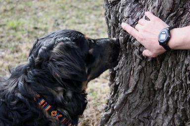 Keywords: track dog taster search black tree sniffing show