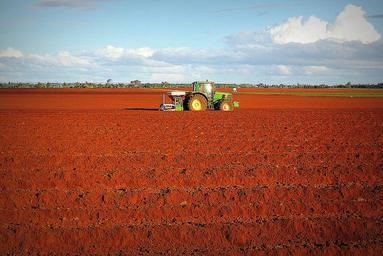 Keywords: tractor farming plowing agricultural farm landscape red soil farmland field red earth soil